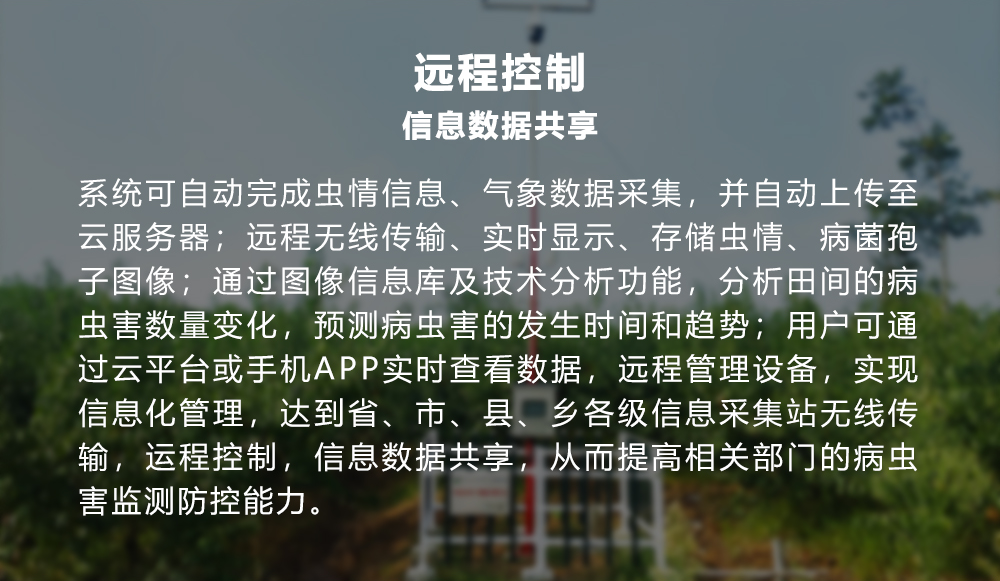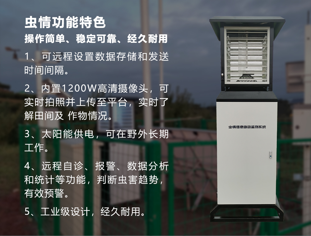 物联网虫情测报预警站是我公司推出的新一代害虫自动测报系统,本系统主要利用现代光、电、数控技术、无线传输技术、户联网技术、构建出一套害虫生态监测及预警系统。该系统集害虫诱捕和拍照、环境信息采集、数据传输、数据分析于一体,实现了害虫的诱集、分类统计、实时报传、远程检测、虫害预警和防治指导的自动化、智能化。