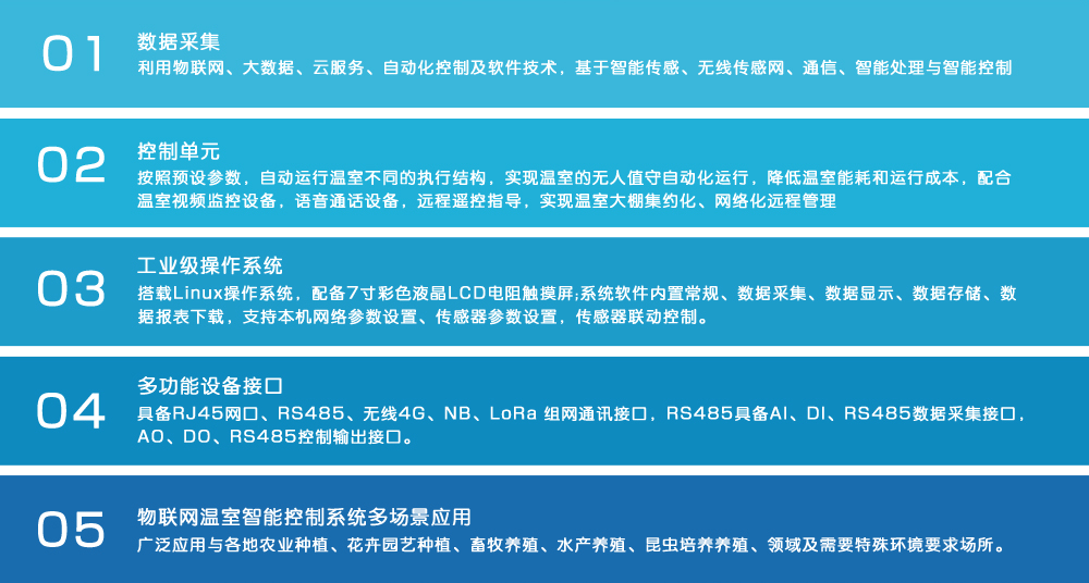 系统通过先进的远程工业自动化控制技术,让用户足不出户远程控制温室设 备。可以自定义规则,让整个温室设备随环境参数变化自动控制。比如光照强 度过高时,自动关闭遮阳降低光照强度。客户可以通过手机在任意地点远程 控制温室的所有设备。